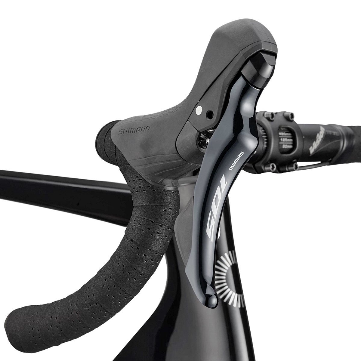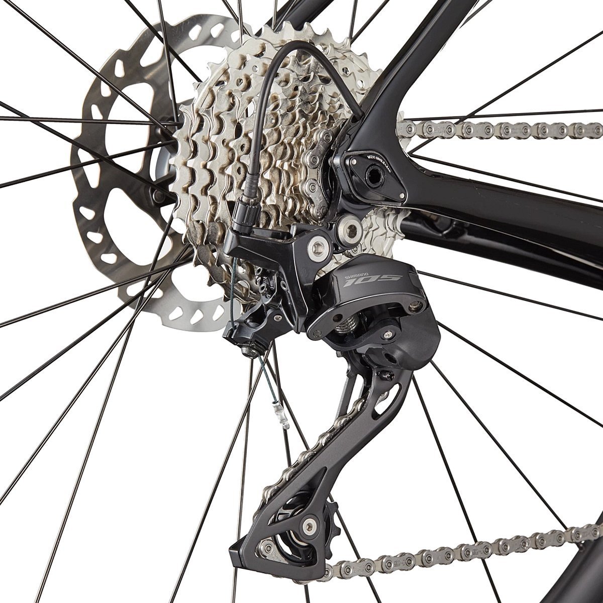 - Freios: Shimano 105 hidráulicos a disco, 160 mm dianteiro / 140 mm traseiro