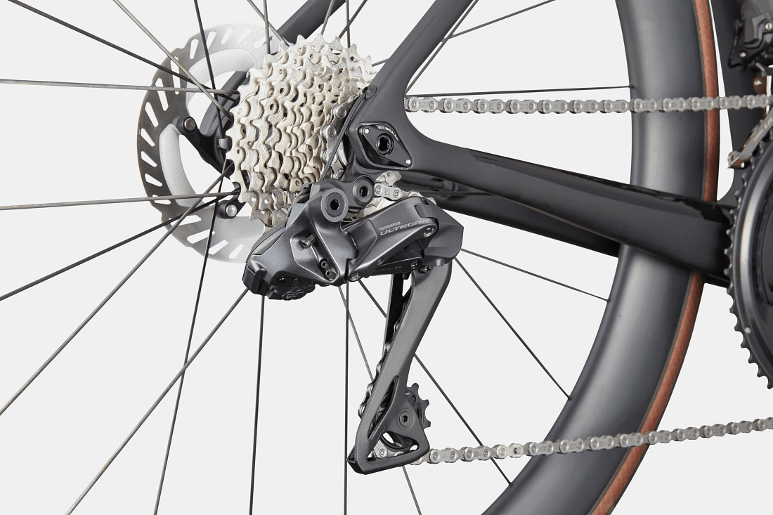 - Quadro: SuperSix EVO Hi-MOD Carbon com roteamento interno dos cabos, eixo traseiro 12×142 Syntace thru-axle, suporte para freio a disco flat mount, espigão integrado, compatível com o sistema SmartSense