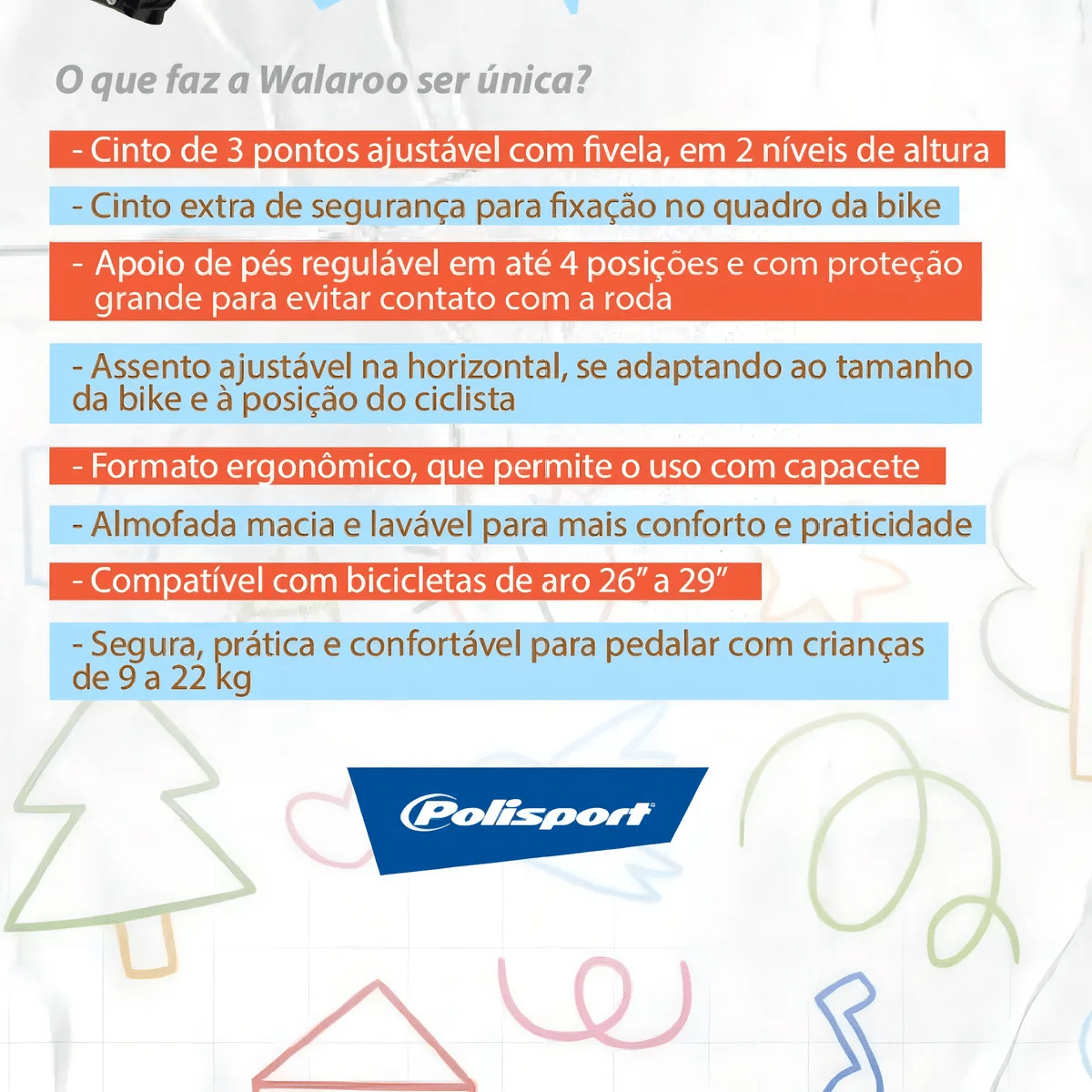 A Cadeirinha Polisport Wallaroo FF é uma opção segura, confortável e prática para transportar crianças em pedaladas urbanas. Projetada para instalação traseira no tubo do selim, oferece amplo suporte ergonômico, ajuste fácil e recursos que valorizam a segurança e o conforto da criança durante o trajeto. O acabamento em cinza com detalhes em laranja confere um visual moderno e discreto à bicicleta.