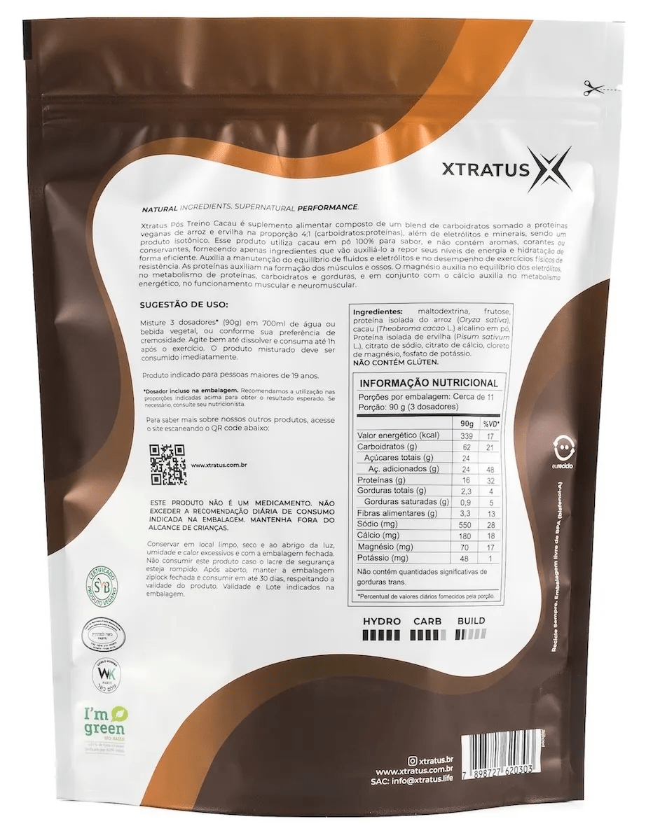 O Pós Treino Xtratus 4:1 Cacau foi desenvolvido para auxiliar na recuperação muscular após treinos intensos ou competições. Sua fórmula combina carboidratos e proteínas vegetais na proporção 4:1, oferecendo reposição energética eficiente e suporte para regeneração muscular após o exercício. :contentReference[oaicite:0]{index=0}