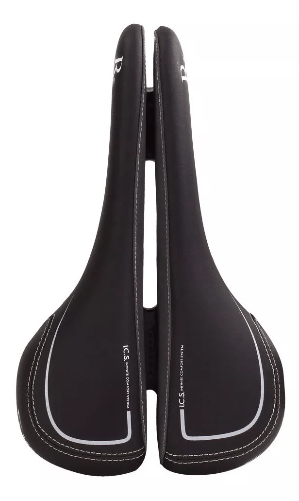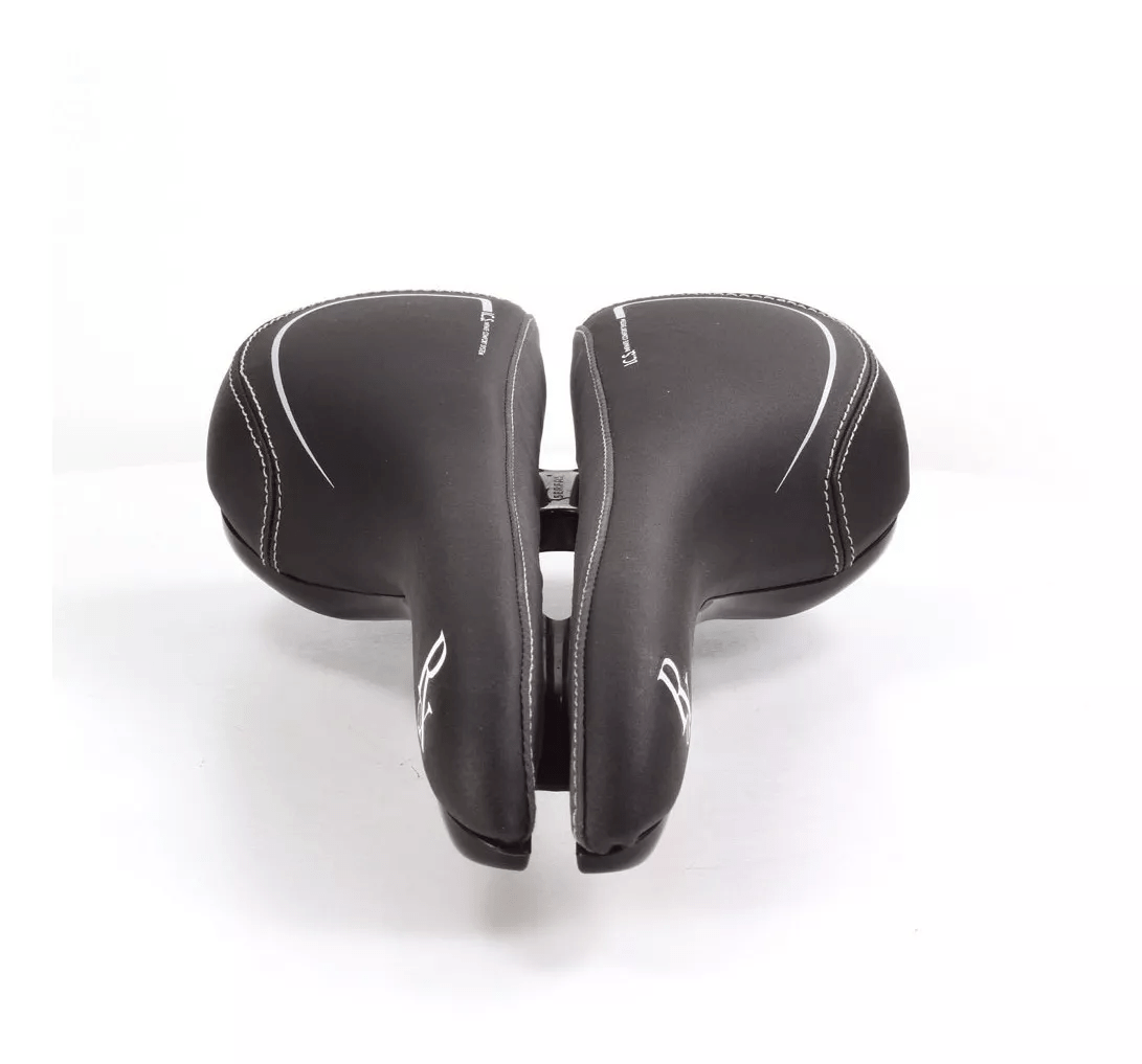 As metades do selim giram independentemente com o piloto para reduzir o atrito e a irritação do selim.