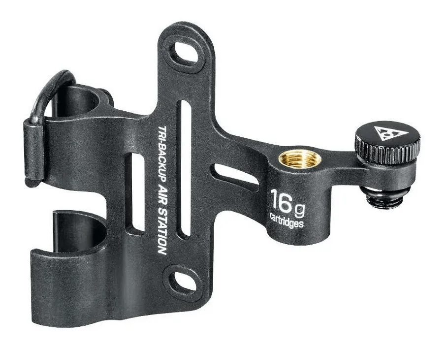 O Topeak Tri-Backup Air Station é um adaptador da linha Tri-BackUp feito para deixar seu kit de emergência completo e organizado: ele permite fixar no sistema Tri-BackUp um inflador de CO2, até 2 cartuchos de CO2 e ainda uma mini bomba. É perfeito para triathlon, speed e treinos longos, porque mantém tudo preso, acessível e sem ficar balançando no bolso.